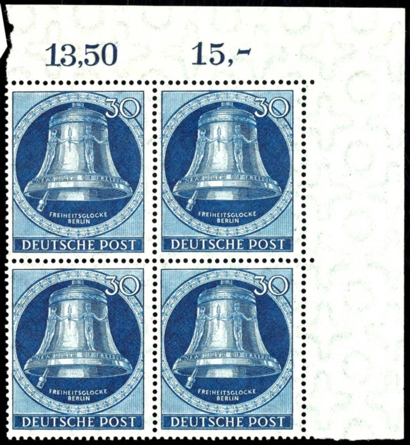 30 Pfennig Liberty Bell (I), corner block of four, top right, mint never hinged, flawless condition, unsigned, Michel 240.- + + (79(4)) 30 Pfennig Freiheitsglocke (I), Eckrandviererblock oben rechts, postfrisch, tadellose Erhaltung, unsigniert, Mi. 240.-++ (Image)