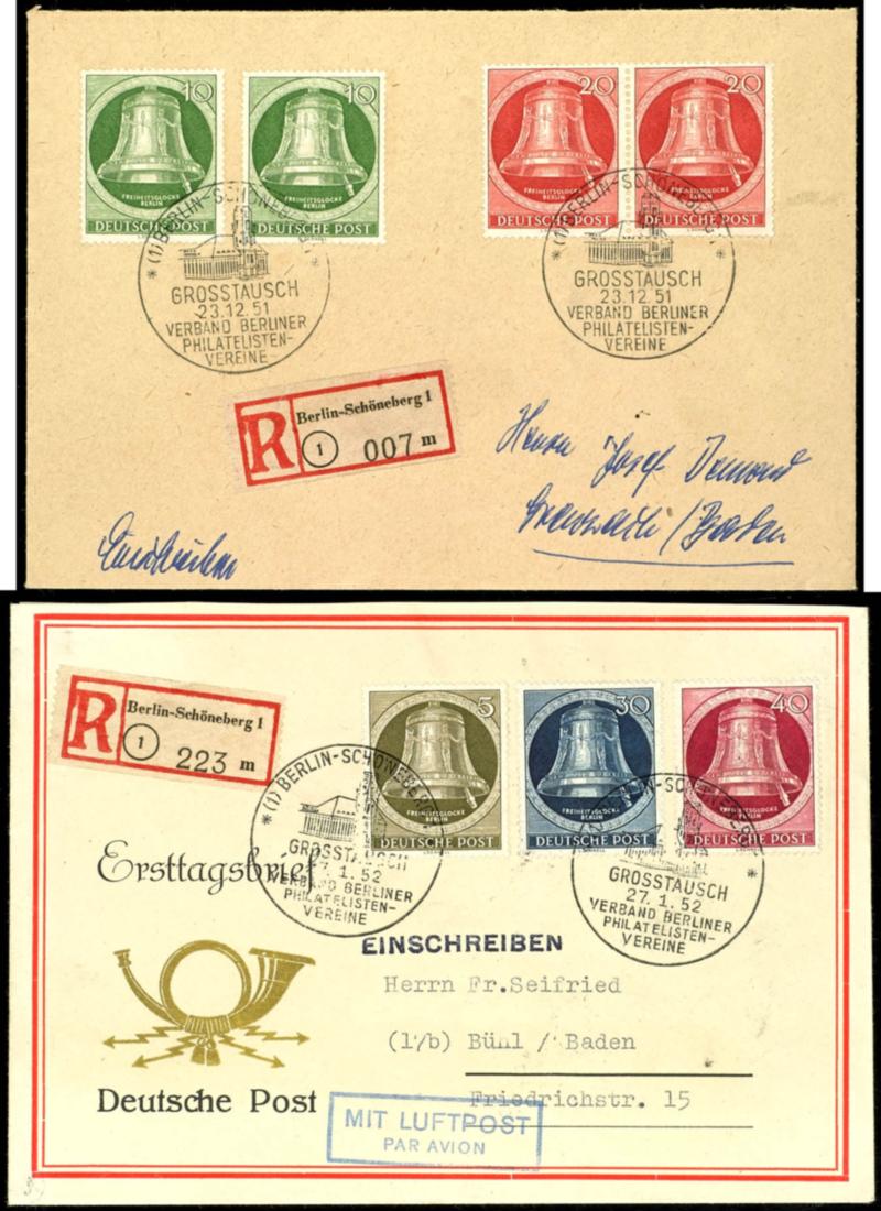 5 Pfennig - 40 Pfennig Liberty Bell (II), complete set of five values on two letters with a first-day special postmark from December 23, 1951, both sent as registered mail and each with an arrival postmark on the reverse, the lot with 5 Pfennig, 30 Pfennig and 40 Pfennig expertised Schlegel BPP, Michel 1. 000.- (82/86) 5 Pfennig - 40 Pfennig Freiheitsglocke (II), kompletter Satz mit fünf Werten auf zwei Briefen mit Ersttagssonderstempel vom 23.12.1951, beide als R-Brief befördert und je rückseitig mit Ankunftsstempel, der Beleg mit 5 Pfennig, 30 Pfennig und 40 Pfennig geprüft Schlegel BPP, Mi. 1.000.- (Image)
