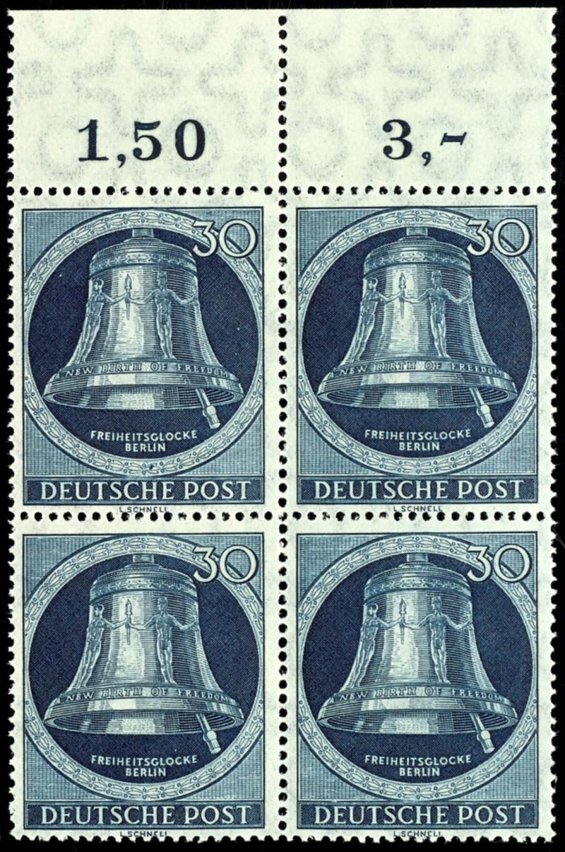 30 Pfennig Liberty Bell (II), fresh block of four with top margin, flawless condition, unsigned, Michel 240.- + + (85(4)) 30 Pfennig Freiheitsglocke (II), Oberrandviererblock postfrisch, tadellose Erhaltung, unsigniert, Mi. 240.-++ (Image)