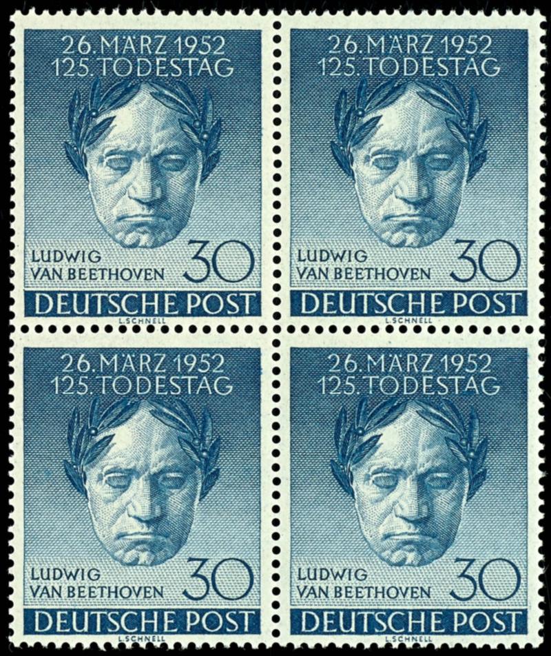 30 Pfennig \125th Anniversary of the Death of Ludwig van Beethoven\, block of four, mint never hinged, flawless condition, Michel 192.- (87(4)) 30 Pfennig \125. Todestag von Ludwig van Beethoven\, Viererblock, postfrisch, tadellose Erhaltung, Mi. 192.- (Image)