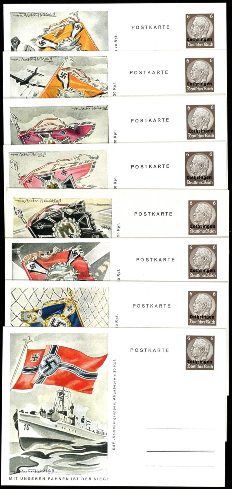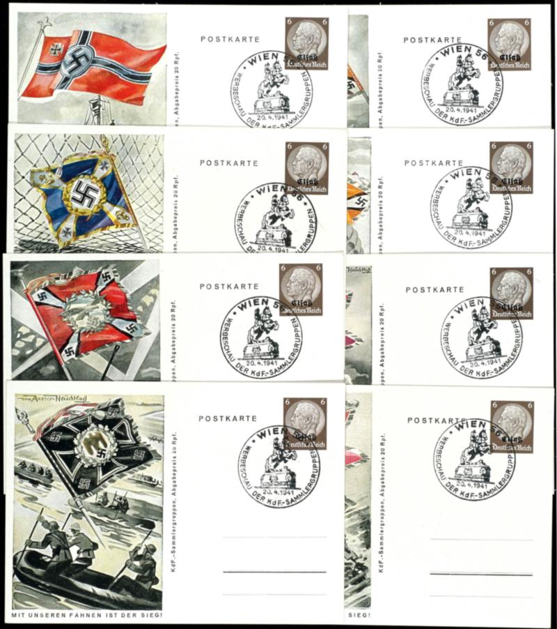 1941, 6 Pfg black brown postal stationery postcards, \"with our flags is the victory\", complete set with 8 cards, all unmailed used from first day \"Vienna 56 promotional show the Kd F collector¦s groups 20.4.1941\" faultless condition (P5.01/08) (Image 1)(Image)