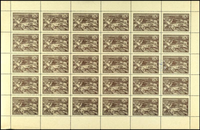 1943, Wlassow-Armee, 10 Rubel Höchstwert im kompletten Original-Bogen zu 30 Stück, ungebraucht ohne Gummierung, ein Teil Bogenrand fehlend, vollständige Bogen sind selten.