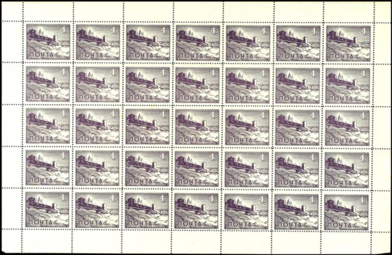 Wlassow-Armee, 1943: 4 Rbl. im kompletten postfrischen(!) Originalbogen à 50 Marken. Im Bogenrand kleinere Antrennungen bzw. kleine Anhaftungen, alle Marken aber einwandfrei postfrisch. Solche kompletten Bogen sind sehr selten zu finden, und wenn, dann meist ohne Gummi. Dieser ist postfrisch!