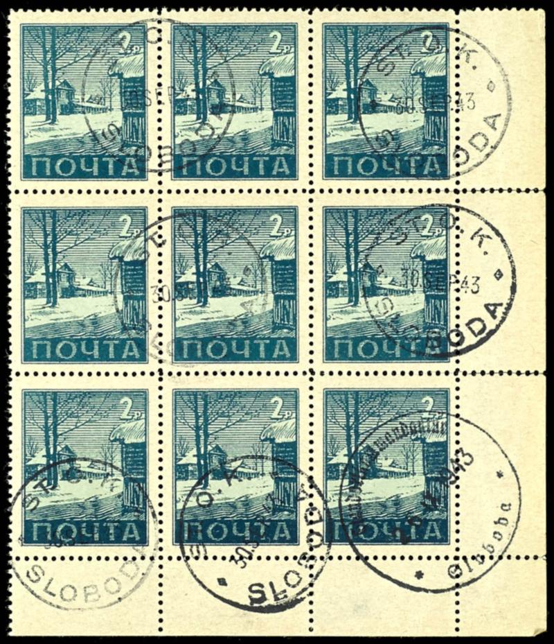 Wlassow-Armee, 2 Rubel, gestempeltes Bogenteil zu 9 Marken vom Eckrand unten rechts, selten.