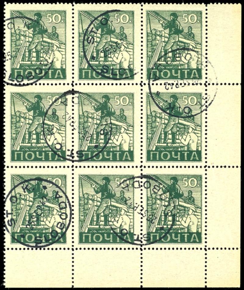 Wlassow-Armee, 50 Kop., gestempeltes Bogenteil zu 9 Marken vom Eckrand unten rechts, selten.