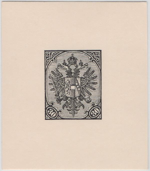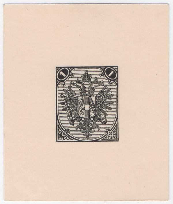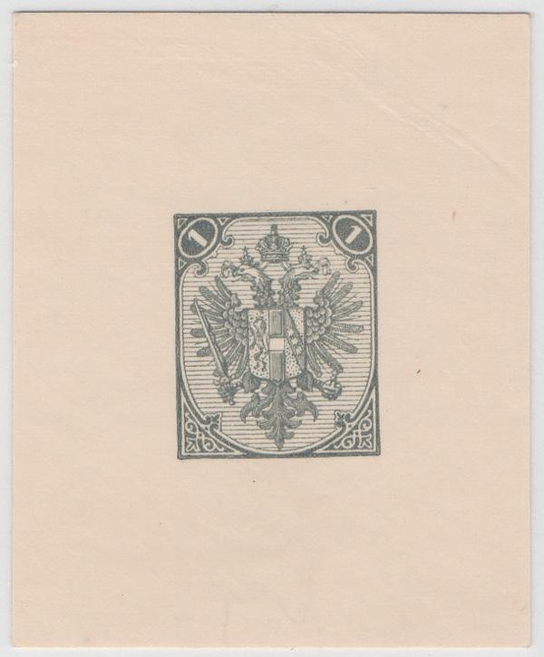 1879 Presentation "Proofs" in large format (Scott 2//10 vars.), 38 x 45mm, a total eight different, six of them on in thin card: five with solid value tablets: yellow, green, ultramarine, brown & violet, one a 5Kr in red; the other two are black on thin paper and blue on thick paper; the first six are 45 x 65mm overall, the black is 44 x 60mm, and the blue is 44 x 53mm; the ultramarine is marked with two small arrows and manuscript "F28"; all fresh and Extremely Fine. A choice, very rare set, commissioned by the Vienna National Printing Co. Michel 1//7 vars. 2//8 vars. (Image)