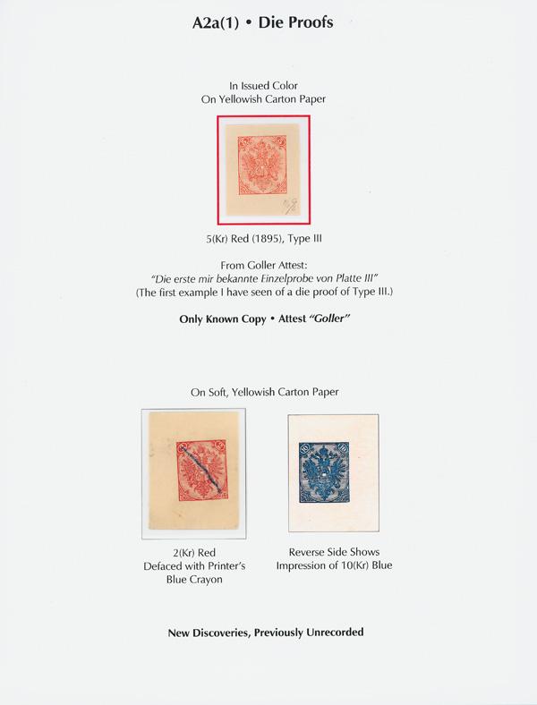1894-98, Typographed, Group of Eight Unusual Die Proofs on card (Scott 1a//10a vars.), 1.) 5kr red, type III 30 x 35mm); 2.) 1kr black, two impressions on one side of a card with 4 impressions of the 2kr yellow on the other, both sides with a single defacing line; 3.) 2kr in red defaced with a blue crayon stroke on one side, an undefaced 10kr dark blue on the other; 4.) ½kr black, two impressions on one side, blue crayon not touching either, and two more ½kr plus a 2kr red on the other, defaced; 5.) 2kr yellow on one side, 1kr gray on the other, both defaced; 6.) 20kr in black with a black manuscript "X"; 7.) 20k olive green, two impressions on one side and two impressions of the 20kr in black, both sides defaced with a single line; and 8.) 25kr, two impressions in different shades of violet on one side and a single 2kr in red on the other, both sides with a single defacing line; all eight are said to be previously unknown, five of them have expert certificates, Fine to Very Fine. Shipping charges apply - weight 0.8 lbs. Michel 1 I//9 I vars. (PDF for this Lot) (Image)