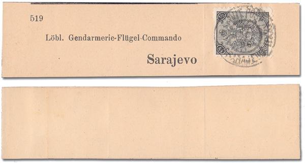 1894-98, Typographed, ½kr black, perf 10½ (Scott 1a), tied by a "K. und K. MILIT:POST XXXII, SARAJEVO, 27/7 96", on newspaper wrapper with a printed address to the local Gendarmerie, exceptionally clean Extremely Fine. A rare ½kr single franking. Michel 9 II. Ferchenbauer 1 II; €700 ($760). (Image)