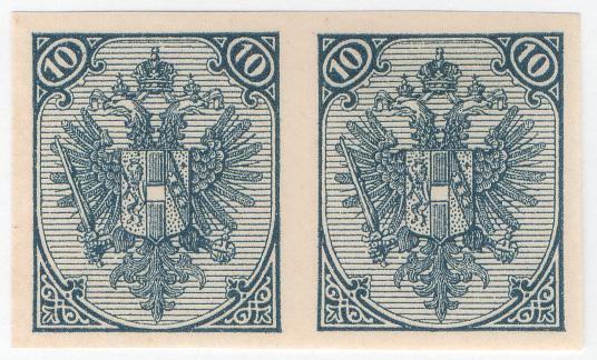 1894-98, Typographed, Plate Proofs in issued colors on thin paper, 1kr-25kr complete (Scott 2a, 4a-10a vars.), 1kr on thin card; choice set horizontal pairs, both 10kr with the "cross in shield" variety, ungummed, Extremely Fine. Michel 1 II P U III, 2 II P U IV-7 II P U IV; €2,200+ ($2,380). Ferchenbauer €1,640+ ($1,770). (Image)