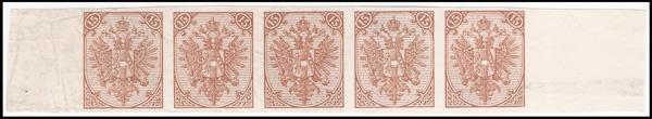 1894-98, Typographed, Plate Proofs in issued colors on thin paper, 1kr-25kr complete (Scott 2a, 4a-10a vars.), 1kr on thin card; large margined singles, plus a horizontal strip of 5 with left & right sheet margins, ungummed, Extremely Fine, with a 2014 A. Goller certificate. Michel 1 II P U III, 2 II P U IV-7 II P U IV; €1,100 ++ ($1,190). Ferchenbauer €995+ ($1,080). (Image)