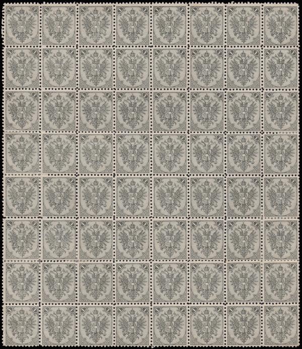 1879-94, Lithographed, 1kr gray, perf 10½ (Scott 2),the unique block of 64, fresh, well centered and quite solid with only minor hinge reinforcement (at least 40 stamps are never hinged), contains partial watermark, "E I T U N G", in rows 5/6, Very Fine, Ex-Marakovic. According to the accompanying certificate, this is the largest recorded perf 10½ multiple of this value., with a 2005 Soecknick certificate. Scott $1,260 as singles. Michel 1 I a L; €2,392 as singles ($2,580). Ferchenbauer 2 I. Ferchenbauer €3,200 as hinged blocks of 4 ($3,460). (Image)