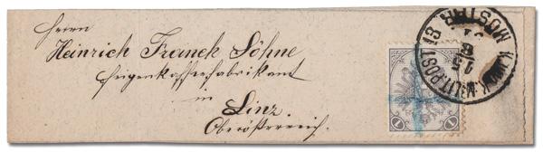 1879-94, Lithographed, 1kr lilac gray, perf 12½ (Scott 2 var.), invalidated with blue crayon but tied by a "K. und K. MILIT:POST 13, MOSTAR, 15/8 94", on a complete newspaper wrapper sent to Linz, Austria and backstamped there on 19 Aug; remarkably clean and well preserved, Extremely Fine. An exceedingly rare legitimate use of an invalidated 1Kr violet gray, with a 2022 A. Goller certificate. Michel 1 I b I. Ferchenbauer 2 I a. Ferchenbauer €1,000 for used off cover. ($1,080).