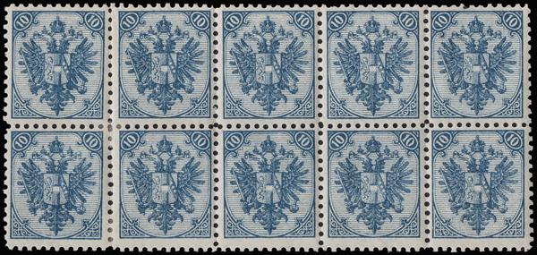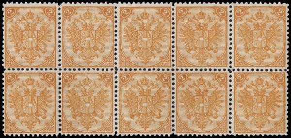 1879-94, Lithographed, 2kr brown orange, perf 11½ (Scott 4 var.), an immaculate mint block of 10, o.g., never hinged, bright, fresh and beautifully centered, Extremely Fine, with a 2017 Ferchenbauer certificate. Michel 2 I d M; €1,000 as singles ($1,080). Ferchenbauer 3 I d; €800 as singles ($860). (Image)