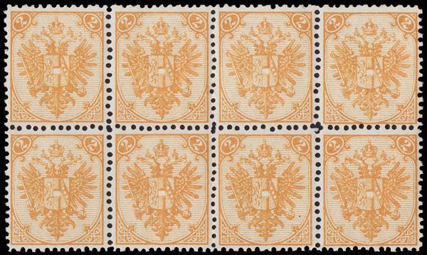 1879-94, Lithographed, 2kr yellow, "Chaotic" perf 12-12¾ (Scott 4 var.), a choice mint block of 8, o.g., never hinged, fresh and perfectly centered; perfs a bit weak, Extremely Fine. Michel 2 I a E; €960 as singles ($1,040). Ferchenbauer 2 I a; €760 as ($820). (Image)