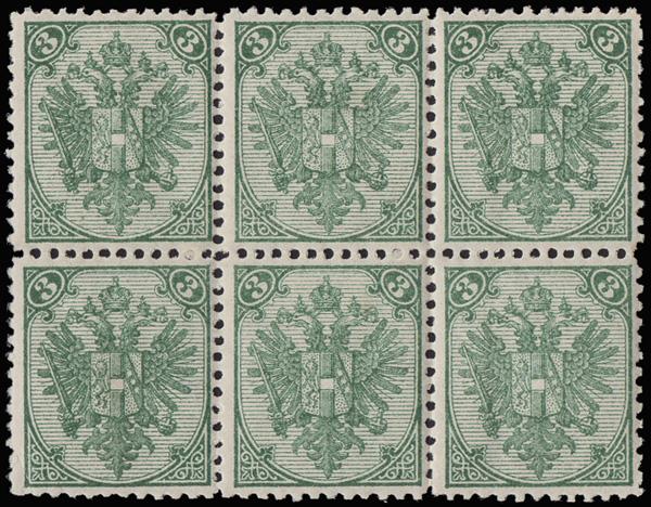 1879-94, Lithographed, 3kr blue green, perf 11½ (Scott 5 var.), a lovely mint block of 6, o.g., never hinged, bright and fresh, Very Fine, with a 2017 Ferchenbauer certificate. Michel 3 I b M; €480 as singles ($520). 4 I b; 360 as singles. (Image)