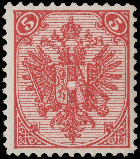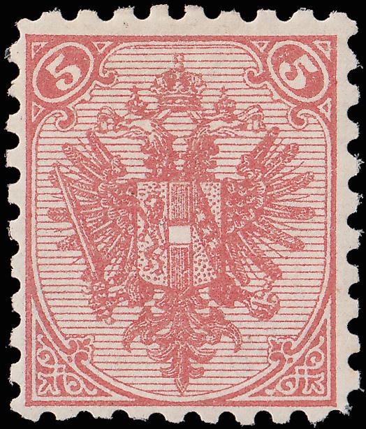1879-94, Lithographed, 5kr red, perf 9¼ (Scott 6 var.), an excellent mint example of this rare perforation, o.g., never hinged ("9¼" in pencil); trivial, very minor internal bend (mentioned only for strict accuracy), Fine to Very Fine, signed Zehner VÕB. Michel 4 I a K; €2,200 for hinged ($2,380). Ferchenbauer 5 I a; €2,250 for hinged ($2,430). (Image)
