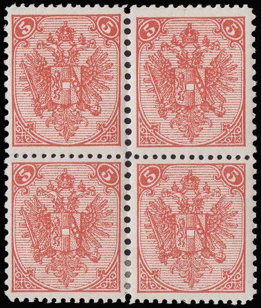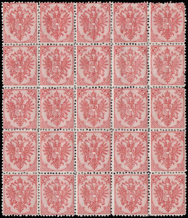 1879-94, Lithographed, 5kr red, "chaotic" perf 12-12¾ (Scott 6 var.), a fresh mint block of 25, o.g., almost entirely pre-emptively hinge reinforced (very little actual separation), Very Fine. Michel 4 I a E; €1,250 as singles ($1,350). 5 I a; 1,250 as singles. (Image)