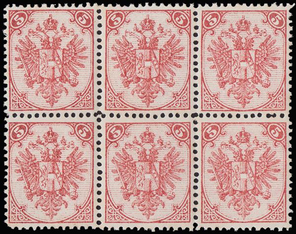1879-94, Lithographed, 5kr red, perf 12 (Scott 6 var.), a pristine mint block of 6, o.g., never hinged, Very Fine. Michel 4 I a A; €600 as singles ($650). 5 I a; 480 as singles. (Image)