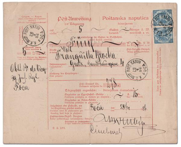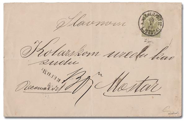 1894-98, Typographed, 20kr olive green, type II, perf 10½ (Scott 9a), tied by a clear "K. und K. MILIT:POST 12, LJUBUSKI, 20/4 98" on a Registered cover to Mostar with "RECOM:" handstamp; backstamped Mostar the next day; light vertical & horizontal file folds, Very Fine and very scarce, signed Ferchenbauer, with his 2013 certificate. Michel 8 II A; €2,200 ($2,380). Ferchenbauer 8 II var. Ferchenbauer €2,250 ($2,430). (Image)