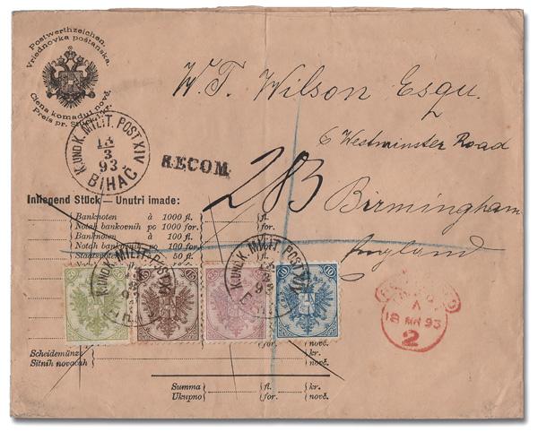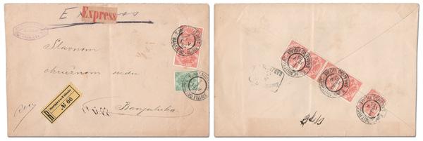 1900, New Currency, 5h green & 10h red, perf 12½ (Scott 14, 16), seven 10h red (5 on the back) and a 5h tied by Sarajevo c.d.s.s, 7 Jul 1903, on a Registered Express cover from Sarajevo to Banjaluka, with an additional 10h red on the front, paying the correct 75h rate for a double-weight Registered Express cover; backstamped Banlaluka the next day; very minor vertical file fold not affecting stamps, Very Fine, with a 2009 Z. Sips certificate. Michel 13 A x, 15 A x. Ferchenbauer 13, 15. (Image)
