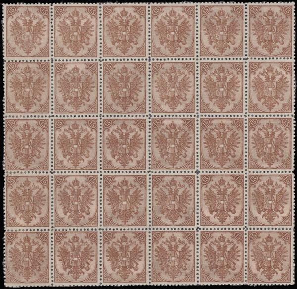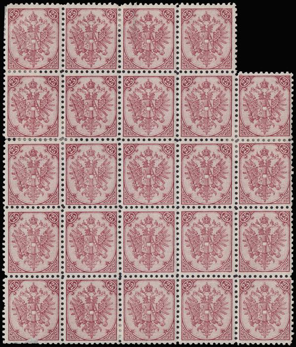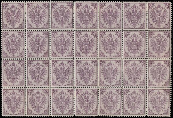 1879-94, Lithographed, 25kr purple, perf 10½ (Scott 10 var.), a bright, fresh, beautifully centered irregular block of 28, o.g., few hinge remnants with some reinforced separation (8 stamps are sound & never hinged); the lower left stamp with a scrape and perf flaws, otherwise Very Fine and quite rare. Scott $4,200 as hinged singles. Michel 7 I e L; €7,560 as hinged singles ($8,160). Ferchenbauer 9 I e; €6,800 as singles ($7,340). (Image)
