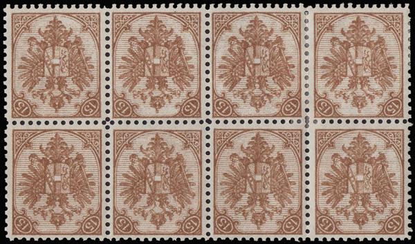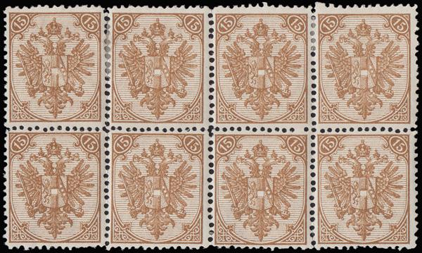 1879-94, Lithographed, 25kr violet, perf 11½ (Scott 10), o.g., multiple hinge remnants, several of them reinforcing separations, nonetheless fresh and sound, Fine to Very Fine. A very rare large multiple, ex-Marakovic and illustrated in Ferchenbauer, p. 190, with a 2005 Soecknick certificate. Scott $3,640 as singles. Michel 7 I a M; €7,000 as singles ($7,560). Ferchenbauer 9 I a; €7,700 as sinles ($8,320). (Image)