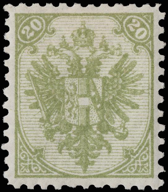 1879-94, Lithographed, 20kr reseda green, perf 10½ (Scott 9 var.), o.g., lightly hinged, fresh and beautifully centered, Extremely Fine. Scott $500 as singles. Michel 8 I c L; €680 as singles ($730). Ferchenbauer 8 I c. Ferchenbauer €675 ($730). (Image)