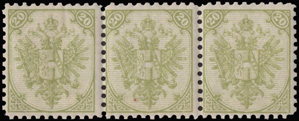 1879-94, Lithographed, 20kr reseda green, perf 10½ (Scott 9 var.), horizontal strip of 3, o.g., lightly hinged, middle stamp never hinged, exceptionally fresh and solid, Fine to Very Fine and rare, end stamps signed Velickovic, with 2005 Soecknick & 1997 Velickovic certificates. Scott $1,900 as singles. Michel 8 I c L; €2,040 as singles ($2,200). Ferchenbauer 8 I c. Ferchenbauer €3,500 ($3,780). (Image)