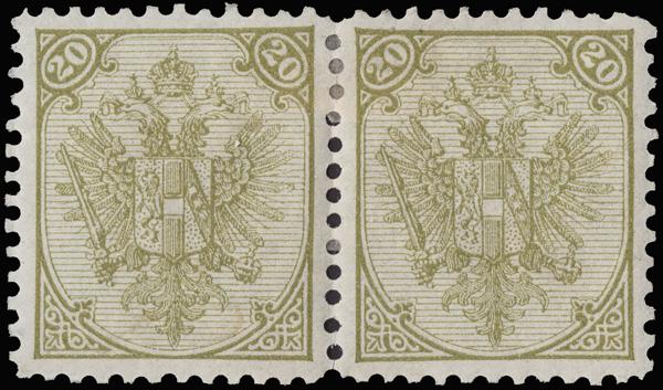 1894-98, Typographed, 20kr olive green, perf 11½ (Scott 9a var.), an exceptional horizontal pair, o.g., small hinge remnant, fresh and perfectly centered, Extremely Fine and rare. One of only two recorded mint pairs, signed Ferchenbauer, with his 2002 certificate. Michel 8 II c; €2,000 as singles ($2,160). Ferchenbauer 8 II. Ferchenbauer €3,000 ($3,240). (Image)