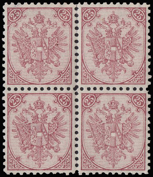 1879-94, Lithographed, 25kr violet, perf 10½ (Scott 10), a fresh, near-perfectly centered block of 4, o.g., never hinged; separation between top stamps, otherwise Extremely Fine, with a 2014 Ferchenbauer certificate. Michel 7 I e L. Ferchenbauer 9 I e. Ferchenbauer €2,250 for a NH block ($2,430). (Image)