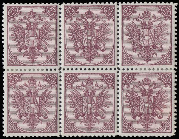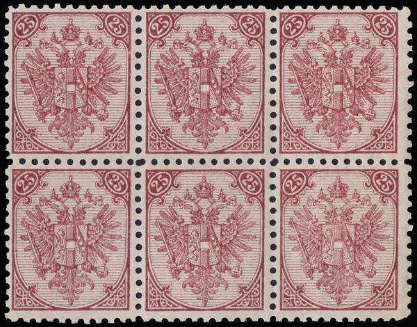 1879-94, Lithographed, 25kr violet, perf 12½/12¾ (Scott 10 var.), a fresh, perfectly centered block of 6, o.g., hinge-reinforced between the two left stamps and between the two right stamp (bottom middle stamp is never hinged), Extremely Fine and choice. Michel 7 I a E; €2,520 as singles ($2,720). Ferchenbauer 9 I a; €2,350 as singles ($2,540). (Image)