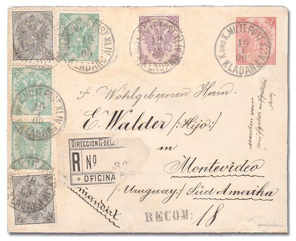 Mixed-Issue, 4-Color franking to Montevideo, Uruguay (Scott 10, 5a, 11), 25kr Lithographed, perf 1½ 3kr Typographed, perf 12½ (3), and 1h New Currency, perf 10½ (2), canceled "K. und K. MILIT:POST XLIV, KLADANJ, 10/1 00" on a 5kr stamped envelope sent registered with handstamped "RECOM:" and manuscript "18"; also bearing a partial Uruguyan registration label and a 2 Feb Montevideo backstamp; very light water staining at the top, presumably from cleaning mildew stains, and detracting little, according to the accompanying certificate, otherwise Very Fine. A very early use of the 1h value and quite an extraordinary cover, signed Ferchenbauer, with his 1978 certificate. Michel 7 I, 3 II, 10 A x. (Image)