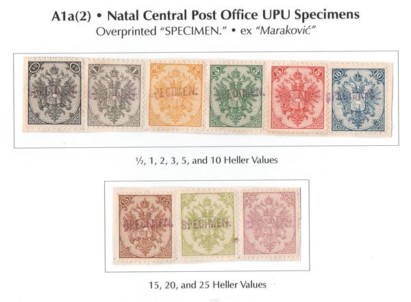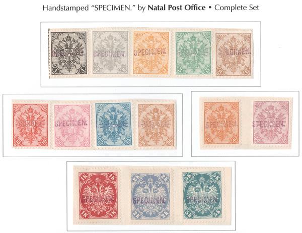 1900, New Currency, "SPECIMEN" overprints, 1h-5kr, perf 12½ complete (Scott 11-24 vars.), each handstamped in violet by the Natal Post Office, affixed to cutouts from a Post Office ledger page, Very Fine, ex-Marakovic, the 1kr-5Kr with a 1981 B.P.A. certificate. Michel 10 A x-23 A x vars. Ferchenbauer 10-23 vars. (Image)