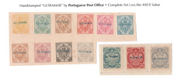 1900, New Currency, Ultramar Specimen overprints, 1h//5kr, perf 12½ complete less the 40h (Scott 11//24 vars), each handstamped "ULTRAMAR" in blue by the Portuguese Post Officefor distribution to one of its overseas colonies, affixed to cutouts from a Post Office ledger page, Very Fine. Michel 10 A x//23 A x vars. Ferchenbauer 10//23 vars. (Image)