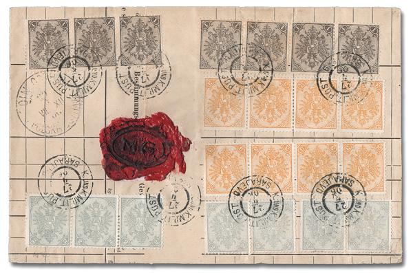 1900, New Currency, 1h, 2h & 3h, perf 12½ multiple 3-color franking (Scott 11-13), seven each of the 1h & 2h and eight of the 3h tied by Sarajevo c.d.s.s, 27 Apr 1906, on the back of a Registered cover to Poská Ostrava; the front bears a Sarajevo registration label and an additional c.d.s.; the back also bears a red "MG" wax seal and a 29 Apr Poská Ostrava receiver. The cover is homemade from an unused ledger sheet and the stamps, which equal the proper 45h registration rate, are, perhaps, arranged patriotically to resemble the black and yellow colors of the Hapsburg flag, Extremely Fine and choice. Michel 10 A x-13 A x. Ferchenbauer 11-13. (Image)