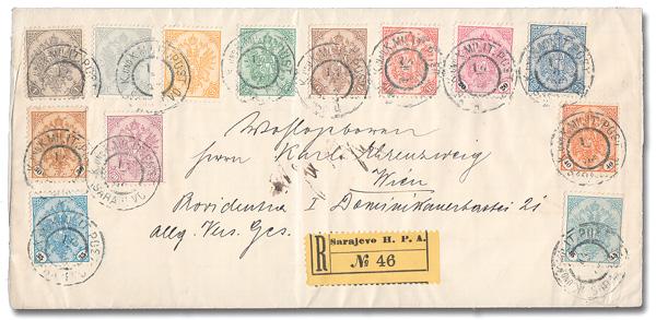 1900-05, New Currency, Mixed Issue franking (Scott 11//29), 18 stamps on the front and back of a legal size wrapper sent Registered from Sarajevo to Vienna, all tied by Sarajevo c.d.s.s, 14 Feb 1906, with a "Sarajevo H. P. A." registration label; 13 different stamps on the front: 1h-50h, the 20h to 45h all with black numerals; on the reverse is a single and a strip of 4 of the 1h, a couple of which are faulty; central vertical file fold, not really affecting any stamps, otherwise Very Fine. A spectacular multicolor franking regardless of its philatelic inspiration. Michel 10//28. Ferchenbauer 10//28. (Image)