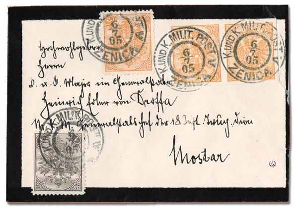 1905 "Special Issue", 3h yellow, imperf (Scott 13 var.), horizontal pair used with a normal 1h & 3h perf 12½ together paying the correct 10h rate, on a small mourning cover from Zenica to Mostar, all tied by Zenica c.d.s.s, 6 Jul 1905; backstamped Mostar the next day; reduced slightly at the right, otherwise Very Fine. Michel 12 U. Ferchenbauer 12 var. (Image)