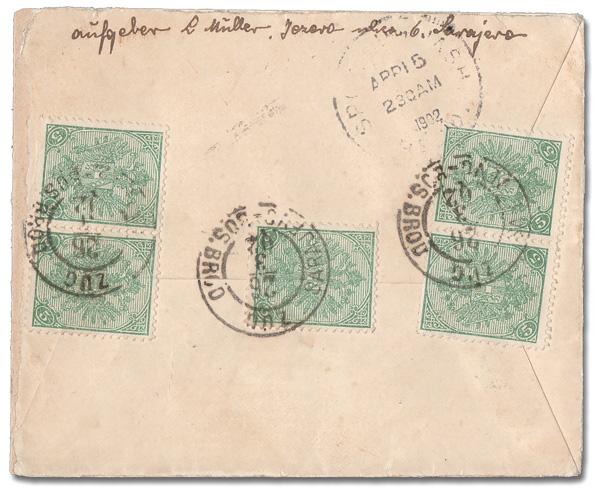 1900, New Currency, 5h green, perf 12½ (Scott 14), two pairs and a single on the back of a small cover from Sarajevo to Spokane, Wash. tied by "ZUG/ SARAJEVO-BOS. BROD, 26/3, 02" T.P.O. c.d.s.s with an 11 Apr New York transit machine cancel on the front and a 15 Apr Spokane backstamp, Very Fine. Michel 13 A x. Ferchenbauer 13. Ferchenbauer €2,925 ($3,160). (Image)