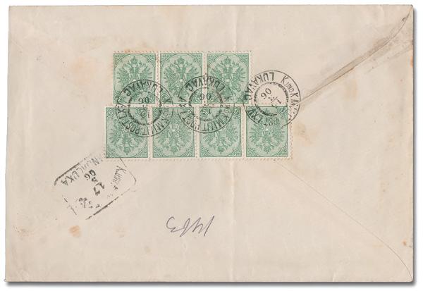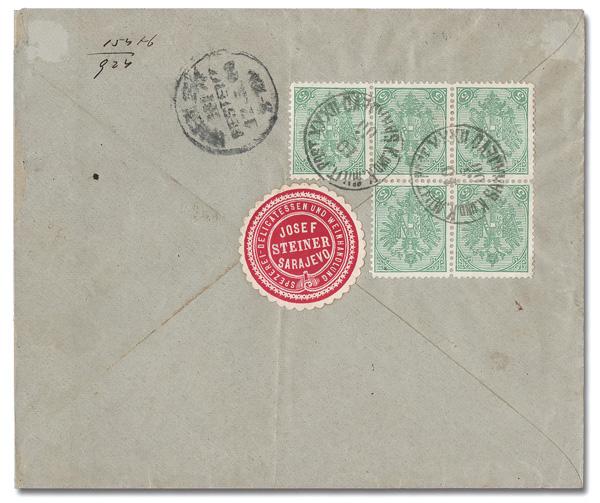 1900, New Currency, 5h green, perf 12½ (Scott 14, 16), block of 5 on the back of a Registered advertising cover from Sarajevo to Vienna, with an additional 10h red on the front, all tied by Sarajevo c.d.s.s 10 May 1900, paying the correct 35h registration rate, with a handstamped "RNT." and a 12 May Vienna backstamp; the cover is from Josef Steiner, a Sarajeva Spicery, Delicatessen & Wine Shop and includes a fancy red Steiner seal on the flap.; very light vertical file fold not affecting stamps, Extremely Fine. An early use of the New Currency stamps. Michel 13 A x, 15 A x. Ferchenbauer 13, 15. (Image)