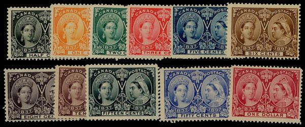 1897 Queen Victoria Jubilee, ½¢-15¢, 50¢, $1 (50-58, 60-61). Original gum, ½¢-8¢ never hinged, 6¢ natural gum skip, couple trifling flaws but generally fresh F.-V.F (photo). $2,250 US$0 (Image)