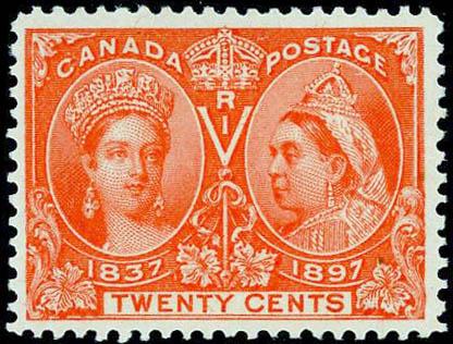 1897, Queen Victoria Jubilee, 20¢ vermilion (59). Original gum never hinged, brilliant color, well centered, Very Fine, lovely stamp (photo). $750 US$0 (Image)