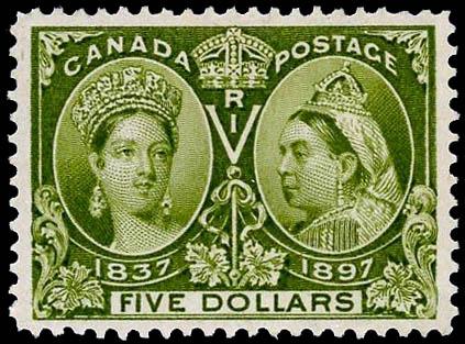 1897, Queen Victoria Jubilee, $5 olive green (65). Original gum hinge remnant, choice centering, beautiful fresh color, choice Very Fine (photo). $1,300 US$0 (Image)