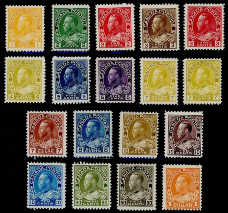1912-25, King George V "Admiral", 1¢ to $1 complete (104-122). Includes an extra shade of #113, original gum never hinged, 107&115, lightly hinged, fresh set, F.-V.F (photo). $2,975 US$0 (Image)