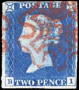 Great Britain, 1840, Queen Victoria First Issue, 2d blue (Scott 2. SG 5), lettered B-I, 4 margins, red Maltese Cross cancel, Fine to Very Fine. Scott $975. SG £975 ($1,250). Estimate $250 - 350. Scott $975 Suggested Bid $250-350 (Image)
