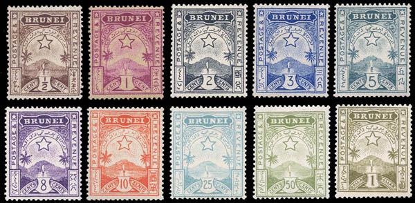 Brunei, 1895, Star and Local Scene, ½¢ to $1 complete (Scott A1-A10. SG 1/10), set of 10, o.g., lightly hinged, Fine to Very Fine. Scott $203. SG £180 ($230). Estimate $75 - 100. Scott $203 Suggested Bid $75-100 (Image)