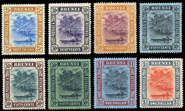 Brunei, 1907-21, Scene on Brunei River, 1c to $1 (Scott 13-37. SG 23/46), set of 26 including shades (missing the $5 and $25 high values), o.g., hinged (a few with slightly brownish gum as is common), Fine to Very Fine. Scott $452. SG £350 ($450). Estimate $120 - 180. Scott $452 Suggested Bid $120-180 (Image)