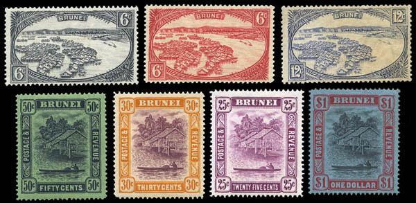 Brunei, 1924-37, River View and Native Houses, 1¢ to $1 complete (Scott 43-61. SG 60/78), set of 19, o.g., lightly hinged (3 low values with brownish gum). Scott $278. SG £250 ($320). Estimate $80 - 120. Scott $278 Suggested Bid $80-120 (Image)