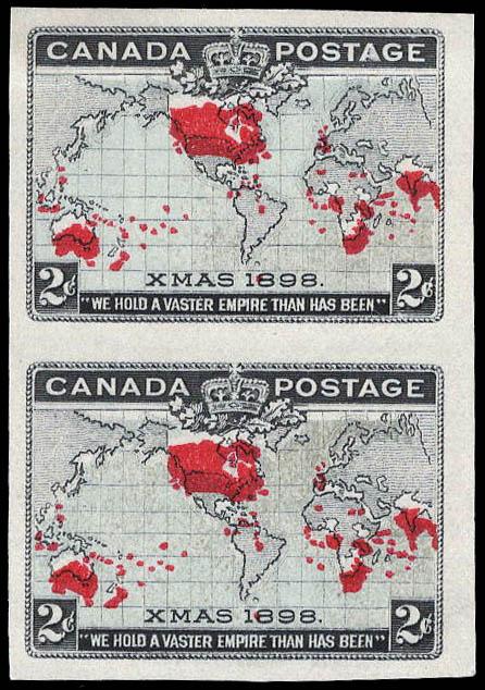 Canada, 1898, Imperial Penny Postage, 2¢ black, blue & carmine, imperf. pair, showing massive shift of red (Scott 86a), without gum as issued, Very Fine to Extremely Fine. Scott $500. Estimate $200 - 300. Scott $500 Suggested Bid $200-300 (Image)