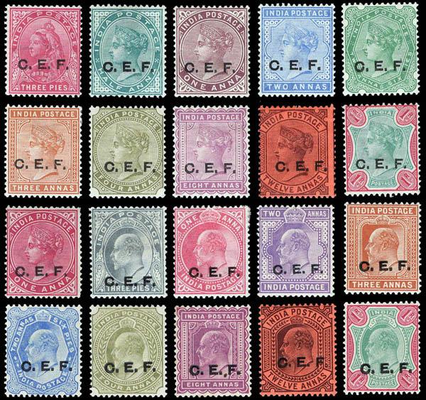 India - China Expeditionary Force, 1900, "C.E.F." on Queen Victoria, 3p-1r complete plus (Scott M1-M10, M11, M12-20. SG C1/10, C11, C12/20), also 1904, "C.E.F." on Queen Victoria, 1a carmine (o.g., n.h.); and 1905-11, "C.E.F." on King Edward VII, 3p to 1r complete, two lovely complete sets, o.g., hinged, Fine to Very Fine. Scott $274. SG £215 ($280). Estimate $75 - 100. Scott $274 Suggested Bid $75-100 (Image)