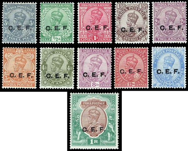 India - China Expeditionary Force, 1914-22, "C.E.F." on King George V, 3p to 1r complete (Scott M23-M33. SG C23/C34), set of 11, o.g., lightly hinged, Fine to Very Fine. Scott $374. SG £350 ($450). Estimate $120 - 180. Scott $374 Suggested Bid $120-180 (Image)